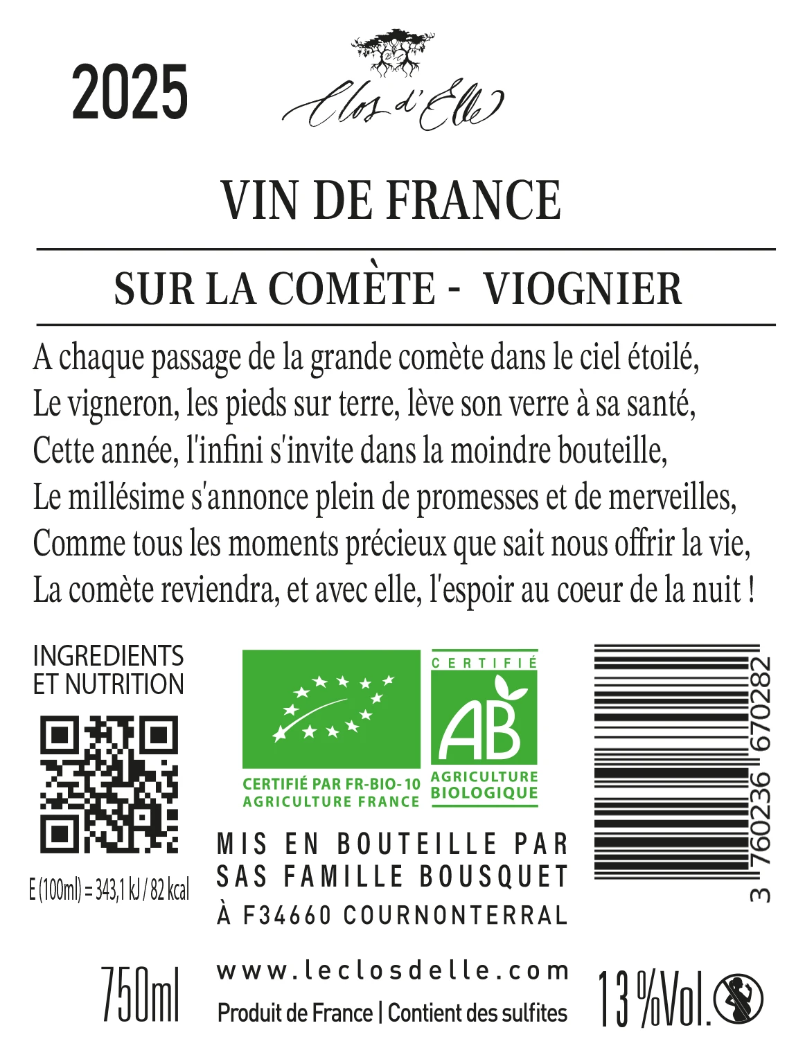 Découvrez le Viognier de la gamme « Sur la comète », un vin de cépage qui exprime la plus pure identité de son terroir sans aucun filtre.